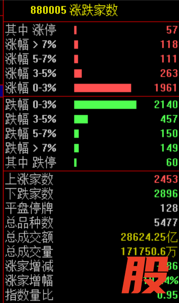 两市共2453只个股上涨,57只个股涨停,2896只个股下跌。