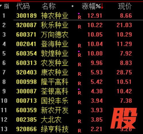 农业股盘中拉升,敦煌种业、登海种业等涨停。