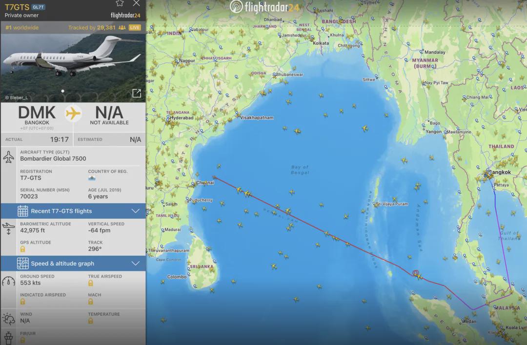 当地时间9月4日,他信搭乘编号T7GTS的私人飞机离开泰国 图源:航班追踪网站Flightradar24截图